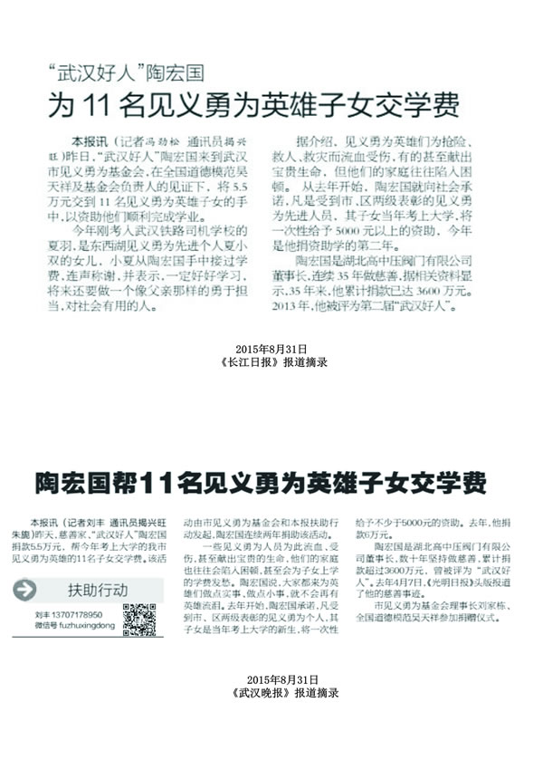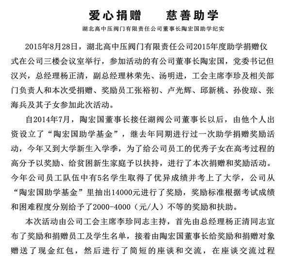 導(dǎo)語:湖北高中壓閥門有限責(zé)任公司董事長陶宏國助學(xué)紀(jì)實(shí)湖北高中壓閥門有限責(zé)任公司董事長陶宏國助學(xué)紀(jì)實(shí)