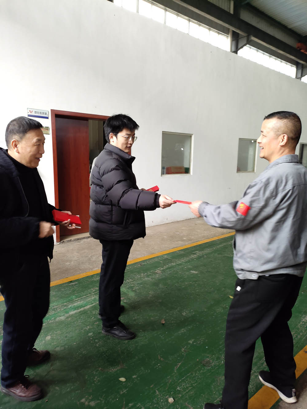 開工第一天公司董事長(zhǎng)、總經(jīng)理及公司高管相攜去往各車間、各部門為每一位湖閥人送上開工紅包及新春祝福語,希望大家在新的一年里熱火朝天地工作,激情似火地生活。