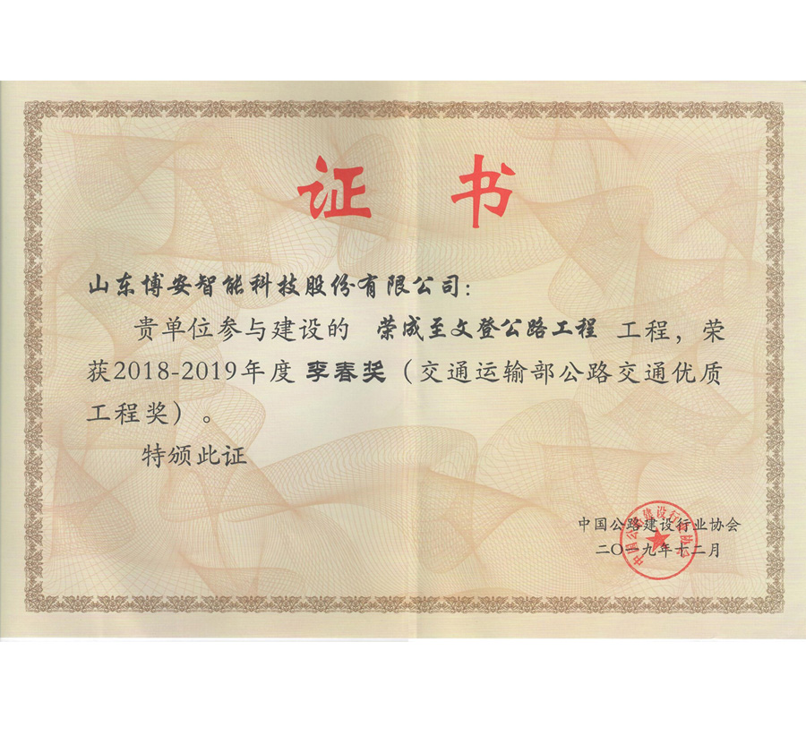 2018-2019年度李春獎(公路交通優質工程獎)證書