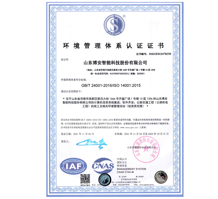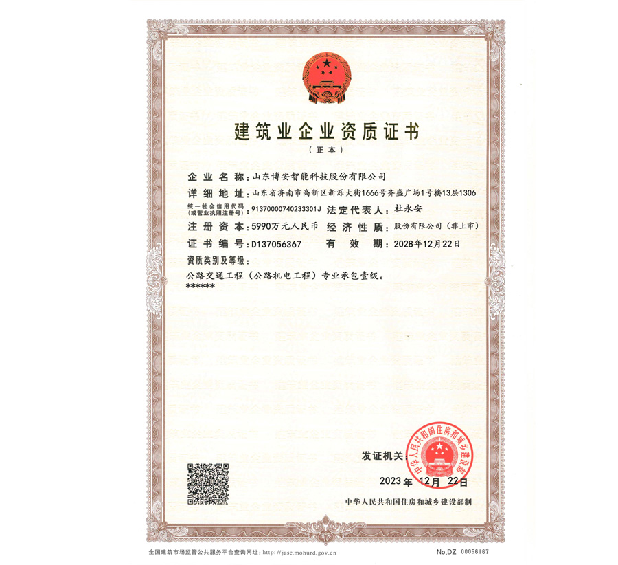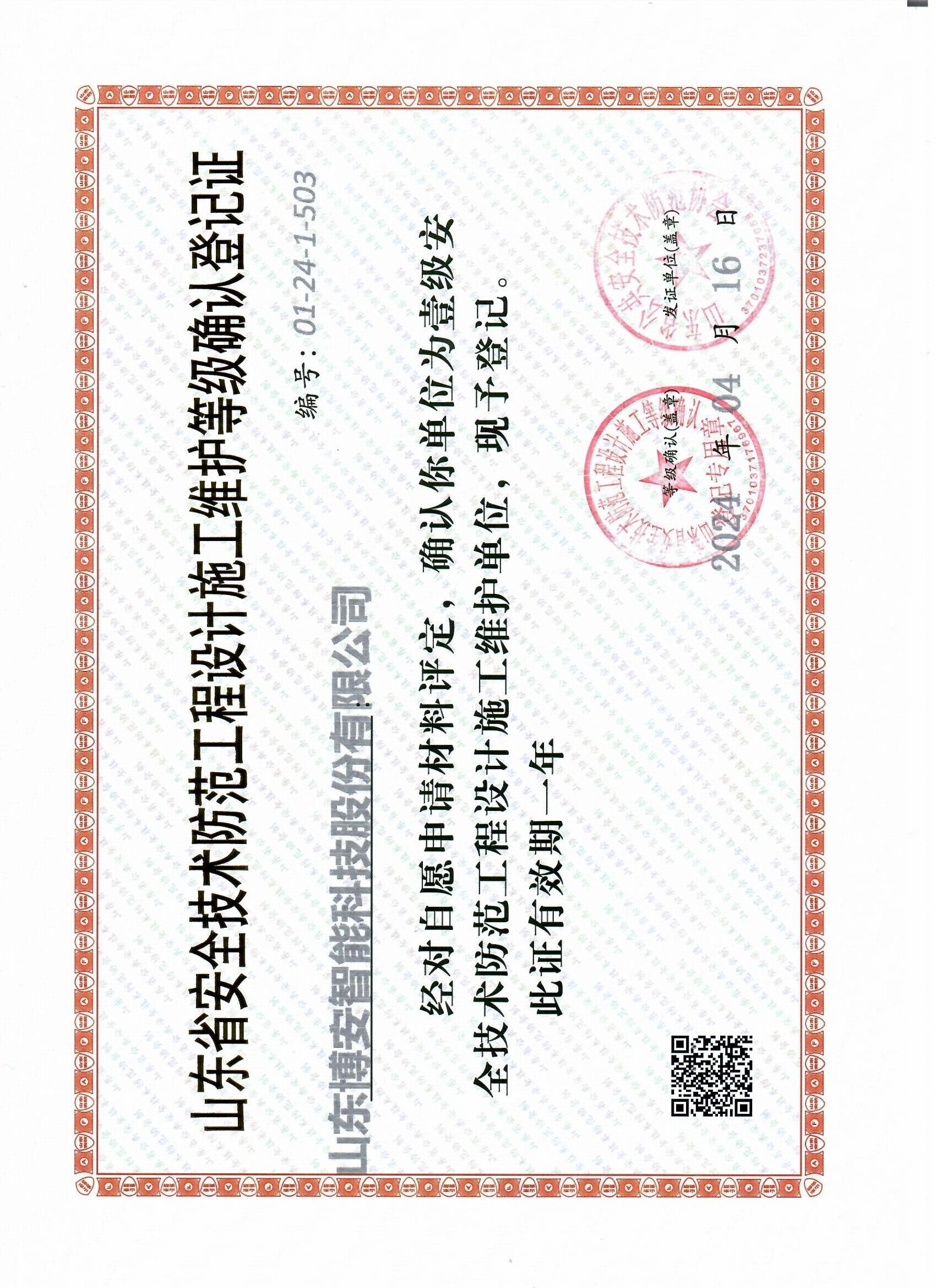 山東省安全技術(shù)防范工程設(shè)計(jì)施工維護(hù)等級確認(rèn)登記證壹級