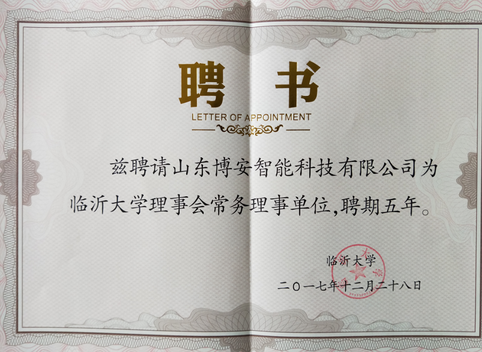 大會表決通過了《臨沂大學(xué)理事會章程》、《臨沂大學(xué)理事會組織機(jī)構(gòu)選舉辦法》,選舉了臨沂大學(xué)理事會組織機(jī)構(gòu)。博安智能榮譽(yù)當(dāng)選臨沂大學(xué)首屆理事會常務(wù)理事單位。